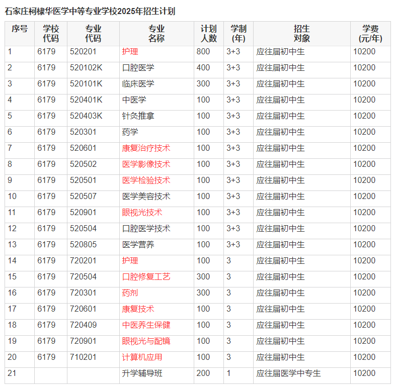 石家莊柯棣華醫(yī)學(xué)中等專業(yè)學(xué)校2026年招生專業(yè)如下: